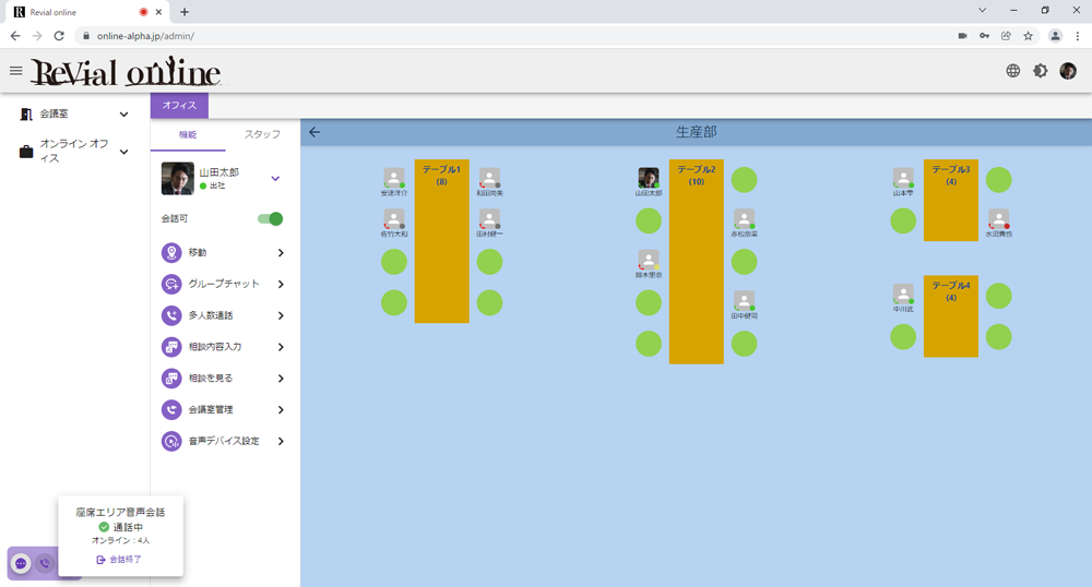 Revial Onlineを使用することにより、社員一人一人が今どこにいるのか、また会話できる状態なのかを一目で確認でき、円滑に業務を進めることができるようになります。